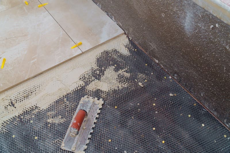 - Разметка и монтаж сетки. Сетка укладывается на расстоянии 5-10 см от стен и разрезается по размеру помещения. Листы сетки соединяются между собой с помощью проволоки или специальных пластиковых хомутов.
